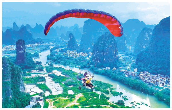 游客乘坐动力滑翔伞俯瞰遇龙河田园风光。(阳朔燕莎航空运动营地供图)