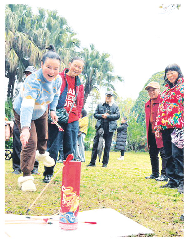 游园互动区内,投壶、丢沙包、投球等传统趣味游戏吸引了大批市民游客驻足参与,排起了长长的队伍。在插花艺术体验区,温馨的氛围格外动人,不少家庭组团参与,在专业花艺师的指导下,修剪花枝、搭配造型,沉浸式感受插花艺术的生活之美。赠花送福环节更是暖意十足,工作人员将精心准备的新春鲜花福袋送到市民游客手中,每一份福袋都承载着满满的新春祝福。
