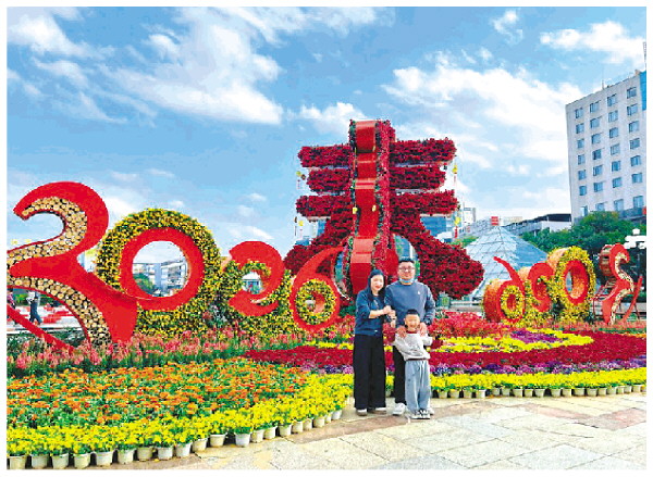 ◤市中心广场,一家人在新春花坛前合影留念。