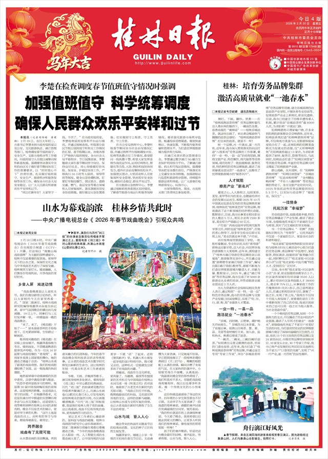 2月18日晚8时,中央广播电视总台《2026年春节戏曲晚会》在央视综合频道(CCTV-1)开播。在这场以“骏驰山海 戏韵春晖”为主题的国粹盛宴中,桂林不仅是重要的取景地,更将甲天下的山水之美、深厚的文化之魂与中华戏曲艺术进行了深度交融。桂林城里万家灯火,暖意融融,人们围坐在电视机前,共享戏曲的美好时光。