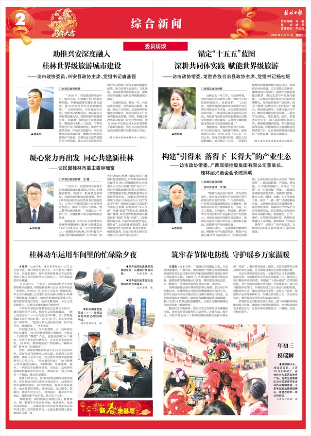 杨桂姬说,桂林市两会召开在即,作为市政协委员,她既满怀期待,更深感责任在肩。2026年是“十五五”开局之年,她将立足委员职责,锚定大局深耕履职,重点抓好三方面。一是紧扣桂林世界级旅游城市建设目标,借助政协协商渠道,立足龙胜生态优势,围绕梯田生态保护、旅游产业链延伸建言献策,推动生态与产业双向赋能。二是推动民族团结进步示范县成果转化,发挥政协联系广泛优势,助力“旅游+民族文化+乡村振兴”融合,推动搭建研学、非遗传承合作平台,擦亮龙脊梯田研学品牌。三是坚守为民初心,紧盯教育、医疗、养老等民生关切,深入基层倾听群众心声,围绕基层慢病管理、零工驿站建设等实事,以提案和民主监督推动优质资源下沉,让世界级旅游城市建设的“龙胜篇章”惠及各族群众。
