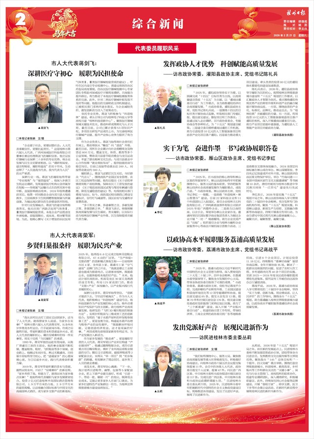 “2025年,荔浦市政协以习近平新时代中国特色社会主义思想为指导,深入贯彻党的二十大及二十届三中、四中全会精神,在荔浦市委坚强领导下,聚焦全市发展的中心大局,带领全体政协委员取得了可喜的成绩。”市政协常委,荔浦市政协主席、党组书记蒋战平介绍,完成砂糖桔产业转型升级、工业园区建设和营商环境优化等12项专题调研和协商,提出意见建议85条,提交大会发言12篇,提案70件和社情民意信息176条,相关建言被党委政府及职能部门采纳后加以实施,助力了“三个新荔浦”建设。深入开展“产业振兴 委员行动”,组建招商引资工作专班,带领经济界、工商企业界的政协委员到广东等地精准招商,引进8个企业项目,计划总投资11.18亿元。持续擦亮“荔事好商量”基层协商品牌,全年开展协商35场,解决了一批群众反映强烈的问题,促进了农村人饮工程、乡村道路亮化等40余个项目的实施。荣获2023—2024年度全区政协履职提质增效先进集体,报刊宣传工作被自治区政协办公厅通报表扬。