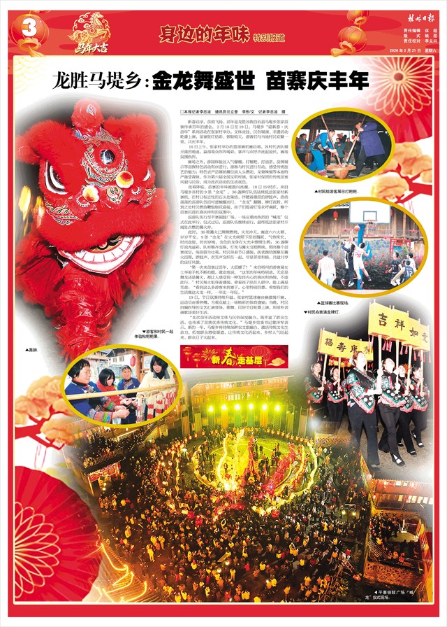 新春启序,苗韵飞扬。苗年是龙胜各族自治县马堤乡张家苗寨传承百年的盛会。2月18日至19日,马堤乡“迎新春·庆苗年”系列活动在张家村举办,文体竞技、民俗展演、非遗活动轮番上演,苗寨张灯结彩、锣鼓喧天,游客们与当地村民欢聚一堂,共庆丰年。