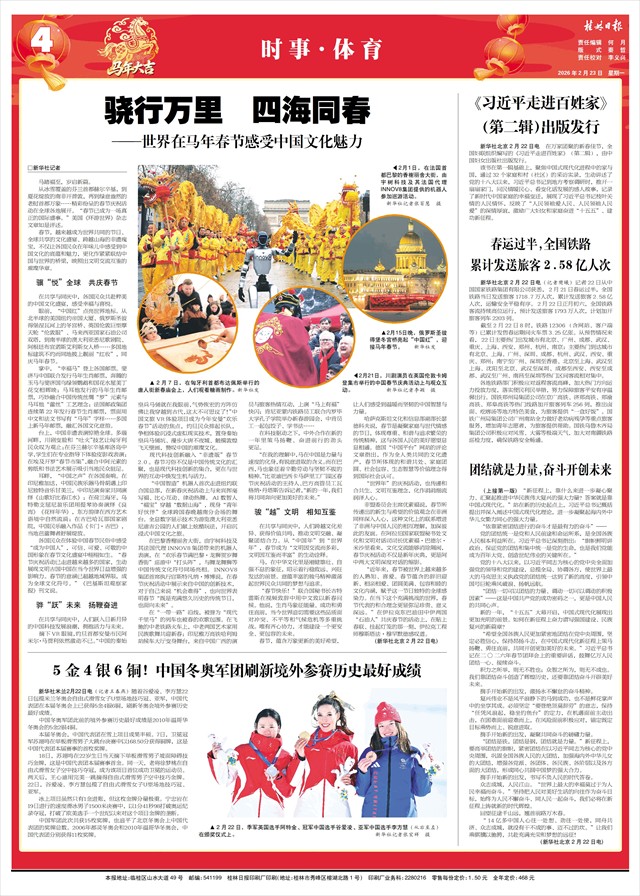 “希望全国各族人民更加紧密地团结在党中央周围,坚定必胜信心,保持昂扬斗志,在中国式现代化新征程上策马扬鞭、勇往直前,共同开创更加美好的未来。”习近平总书记在二〇二六年春节团拜会上的重要讲话,鼓舞亿万人民团结一心、接续奋斗。