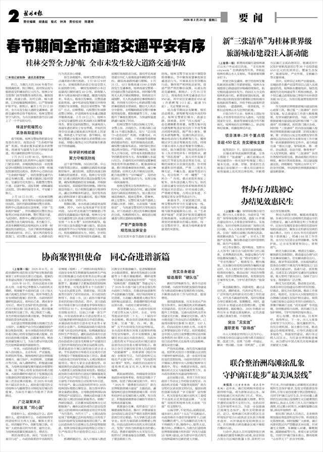 昨日,为期九天的2026年春节长假圆满结束。假日期间,面对探亲流与旅游流交织叠加的巨大压力,桂林公安交管部门高等级勤务全程在线,聚焦国省道、高速公路、农村公路、城市道路,以科技赋能精准管控,以严管厚爱护航平安。据统计,截至2月23日20时,全市未发生较大道路交通事故,道路交通形势总体平稳有序,桂林交警用坚守与担当,为市民游客的春节出行画上了一个平安的句号。