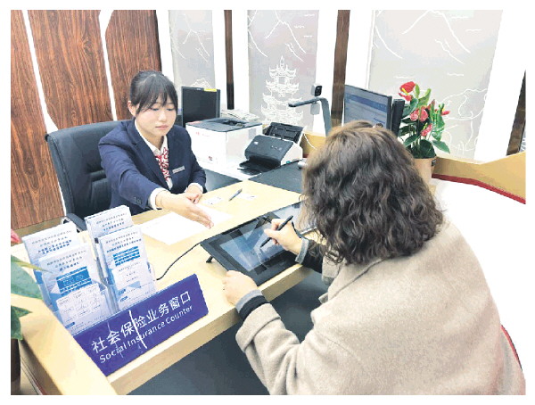 工行桂林阳桥支行营业室社会保险业务窗口工作人员耐心为客户办理社保业务。