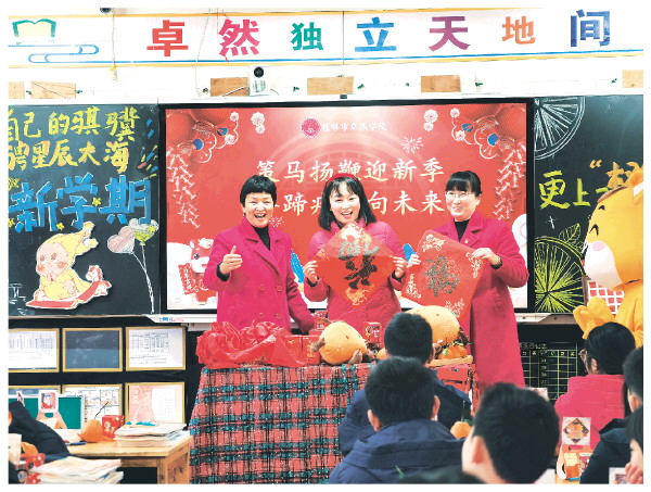 穿过校门,迎新拍照打卡点前排起长队,孩子们在镜头前定格灿烂笑脸。沿着校园大道前行,“马上有福”拼贴福气墙上,各式各样的“福”字逐渐填满展板。一旁的“Flag良驹驮喜”心愿墙前,孩子们认真写下新学期心愿,小心翼翼地挂在“良驹”造型上。