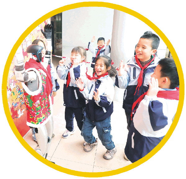 ▲桂林市英才小学的孩子们兴奋地与机器人互动。 记者陈静 摄