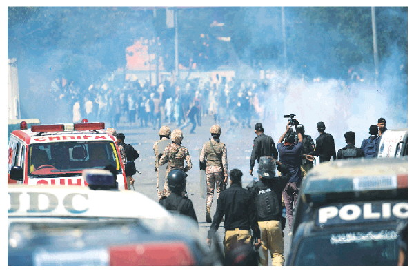 ▲巴基斯坦官方紧急救援组织“救援1122”发言人3月1日对新华社记者说,当天在巴基斯坦南部城市卡拉奇的美国驻卡拉奇领事馆外发生的抗议活动中已有至少9人死亡、20人受伤。抗议活动是在伊朗最高领袖哈梅内伊遇害后发生的。该发言人表示,当时示威者试图进入领事馆,执法人员使用催泪瓦斯和警棍等来控制局势。新华社发(伊姆兰·阿里摄)