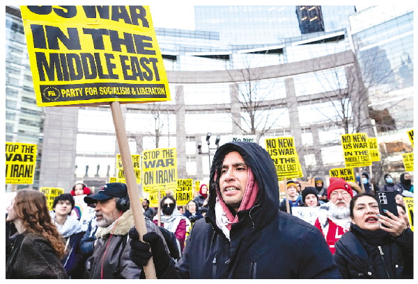 2日傍晚,数百名抗议者冒着严寒在纽约市哥伦布圆形广场集会,组织方代表发表演讲,人们手持标语,大声呼喊反战口号,要求“停止针对伊朗的战争”,随后开始游行示威。