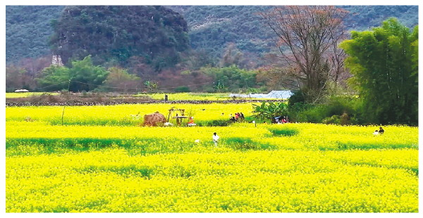 本报讯(通讯员覃庆芳)春风拂过,阳朔县遇龙河沿线千亩油菜花近日竞相绽放,金黄的花海与青山绿水、竹筏村落相映成趣,构成一幅春日限定版的山水田园画卷。