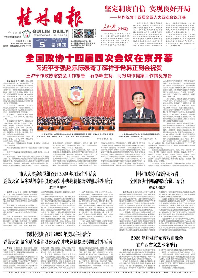 全国政协十四届四次会议开幕会 罗试坚出席   本报讯(记者张婷婷)3月4日下午3时,全国政协十四届四次会议在人民大会堂开幕。桂林市政协系统干部职工和部分政协委员、各民主党派、工商联,通过集中统一、自行组织等方式,学习收看开幕会盛况,聆听全国政协主席王沪宁所作的全国政协常委会工作报告。市政协主席罗试坚,自治区政协常委陈丽华出席学习收看活动。市政协副主席、党组副书记文建中,市政协副主席谭建国、王昕、郑平、卢全喜,秘书长徐熔参加活动。