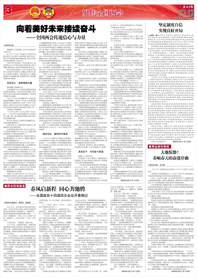 坚定制度自信 实现良好开局 ——热烈祝贺十四届全国人大四次会议开幕   河山添锦绣,神州尽春晖。3月5日,十四届全国人大四次会议在北京隆重开幕。近3000名全国人大代表肩负人民重托齐聚首都,共商“十五五”发展大计,共谋中国式现代化建设新篇。我们对大会的召开表示热烈祝贺!