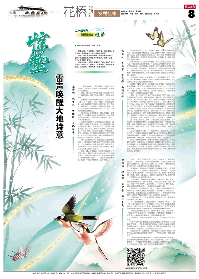 古人将惊蛰分为三候:“一候桃始华,二候仓庚鸣,三候鹰化为鸠。”在桂林,惊蛰的物候藏在穿山公园的桃林里,藏在两江四湖新绿的柳梢上,更藏在这无处不在的春雷声中。它不似雨水那般委婉含蓄,而是直截了当地告诉天地:春天,已然势不可挡。