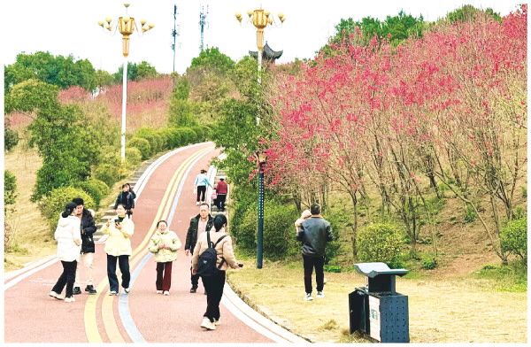 ▲桃花盛放,春意满山林,吸引许多市民前来散步。 杨海萍 摄