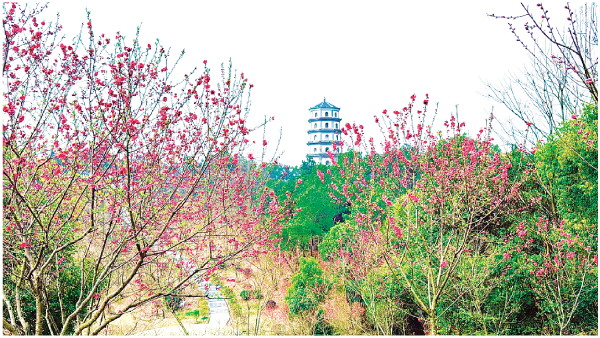漫步公园,粉白嫣红的桃花缀满枝头,一簇簇、一串串,如云霞轻绕,似胭脂点染。微风拂过,花瓣轻轻摇曳,伴着淡淡花香,沁人心脾。古塔与繁花相映成趣,枝头繁花灼灼,树下笑语盈盈,市民游客结伴而来,赏花、拍照、漫步,尽享春日美好时光。