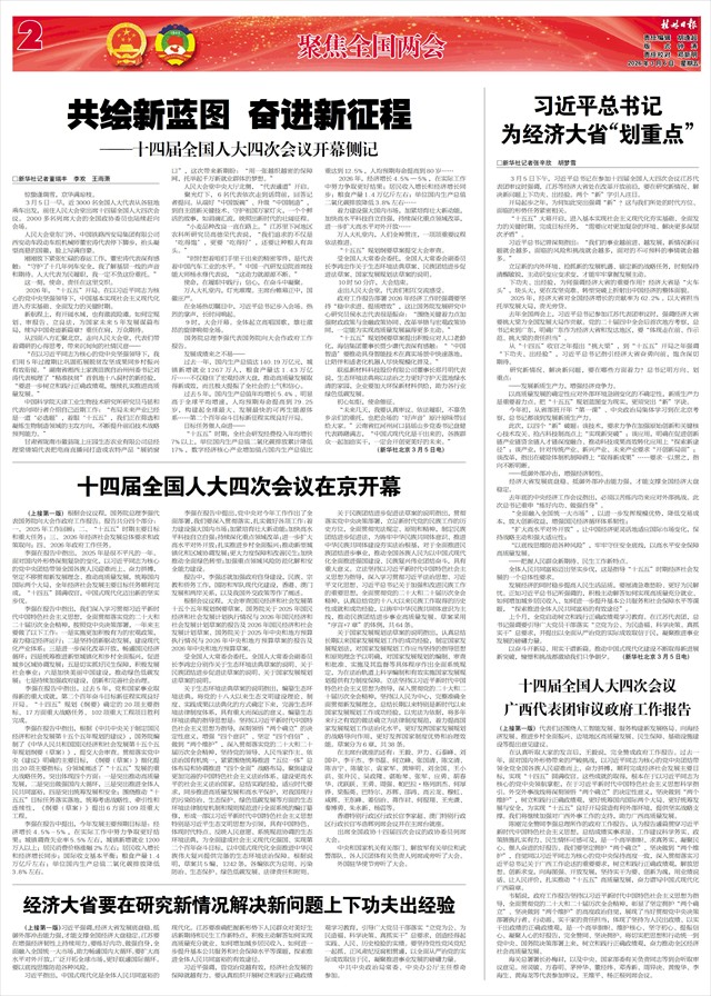 胡帆、朱会东、唐轶昂、黄江、钟畅姿、迟威、白松涛、黄智宇、陈洁英、黄覃梅等代表作了发言,一致认为政府工作报告深入贯彻落实党的二十届四中全会精神和中央“十五五”规划《建议》部署要求,紧紧围绕以中国式现代化全面推进强国建设、民族复兴伟业中心任务,完整准确全面贯彻新发展理念,践行以人民为中心的发展思想,总结成绩振奋人心,分析形势客观精准,确定目标科学合理,提出举措切实可行,是一个从实际出发、按规律办事的好报告。(下转第二版)