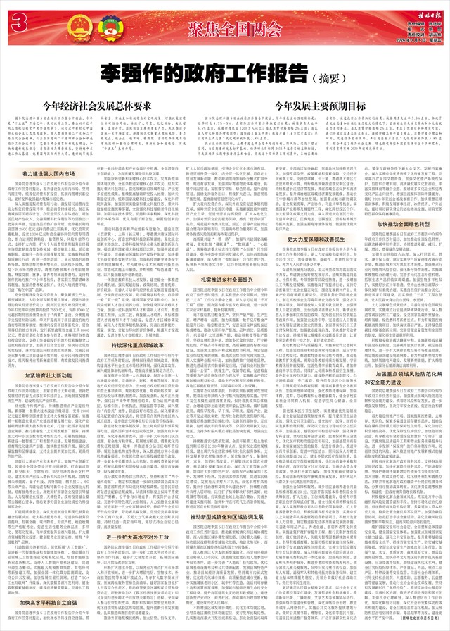 (上接第一版)根据会议议程,国务院总理李强代表国务院向大会作政府工作报告。报告共分四个部分:一、2025年工作回顾;二、“十五五”时期主要目标和重大任务;三、2026年经济社会发展总体要求和政策取向;四、2026年政府工作任务。