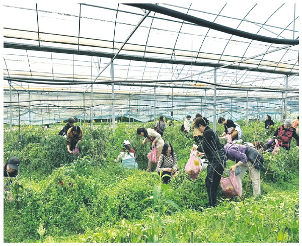 ◤大家一起体验蔬菜采摘。 七星村委供图