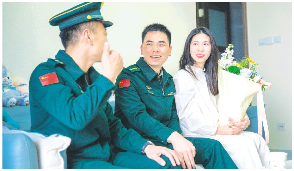 在第116个“三八”国际劳动妇女节来临之际,武警广西总队桂林支队精心组织“巾帼暖军心·同心筑强军”主题活动,邀请女官兵及军属代表齐聚军营,以座谈联欢等形式,传递组织关怀、共叙鱼水深情,凝聚起强军兴军的磅礴合力。此外,支队还组建队伍带着精心准备的鲜花与节日贺卡,上门向军嫂们送上专属祝福,向她们致以支队的关怀与崇高敬意。图为支队领导与官兵及其家属交谈。