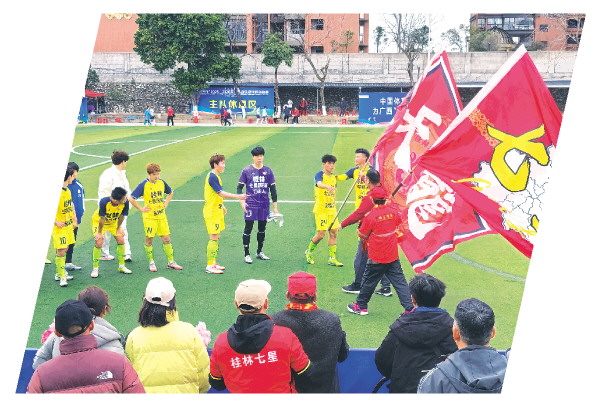 赛后,桂林市七星区队致谢球迷,从球迷手中接过队旗。