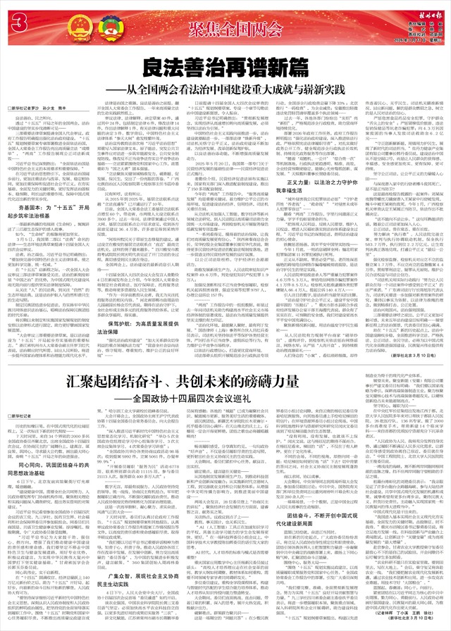 谋发展、谈创新、问民生、促团结……一场场热烈讨论、一次次真诚交流,党中央治国理政的实践在对基层实情的体察中进一步丰富,源自广袤大地的民智民声百川奔流般汇入国家发展蓝图,古老民族对美好未来的奔赴信心满怀——这是共商国是殿堂中不断写下的新篇,更是全过程人民民主真谛的生动诠释。