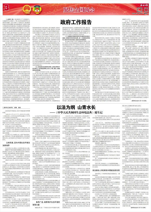 来自基层一线和生态保护一线的代表,更是把使命扛在肩上。全国人大代表、阳朔县金宝乡久大村党总支部书记王光宁表示,会议对乡村振兴、民生保障作出新部署,为基层工作指明方向、增添动力,回到岗位后将第一时间把政策传递给村民,扎根乡村、实干担当,全力推动乡村全面振兴。全国人大代表、桂林漓江风景名胜区战略发展处副主任汤建伟认为,“十五五”规划纲要和生态环境法典的通过,为保护漓江、保护桂林山水提供了坚强法治保障,将以更高标准推进生态保护,为世界级旅游城市建设筑牢生态根基。