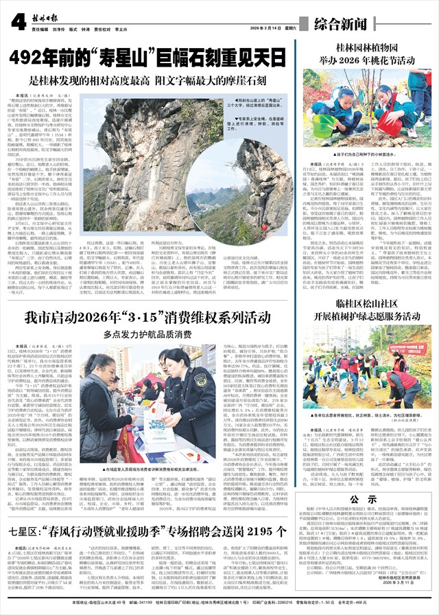 492年前的“寿星山”巨幅石刻重见天日 是桂林发现的相对高度最高 阳文字幅最大的摩崖石刻   本报讯(记者周文琼 文/摄)“爬到这里的时候我用手擦掉青苔,发现石壁上竟然刻着巨大的字,再细看写的是‘寿星’。”近日,桂林一市民爬山意外发现巨幅摩崖石刻。桂林市文化广电和旅游局高度重视,迅速开展调查。经桂林市文物保护与考古研究中心专家实地勘察确认,该石刻为“寿星山”,是明代嘉靖甲午年(1534)所刻,距今已有492年历史。因其地处险峻崖壁,规模宏大,一举刷新了桂林石刻相对高度最高、阳文字幅最大的两项纪录。