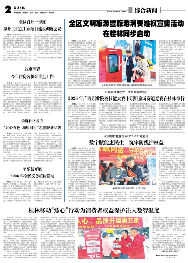 本报讯(记者唐健扬 文/摄)为深入推进文明旅游建设,规范旅游市场秩序,保障游客合法权益,进一步激发广西旅游消费潜力,3月14日,全区文明旅游暨旅游消费维权宣传活动在南宁、桂林、北海三地同步启动。活动以“文明智游·潮玩美景——壮美广西 文明同行 理性消费 依法维权”为主题,通过宣传展示、互动体验等形式,推动文明旅游理念深入人心。
