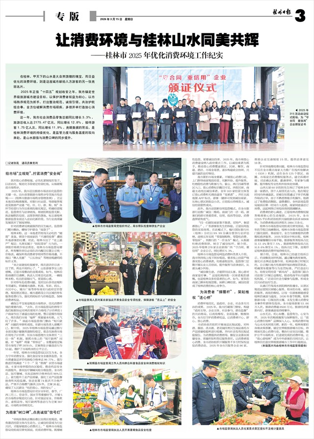 “单纯依靠执法整治难以实现长效规范,唯有激活经营主体内生动力,让诚信经营成为行业共识,才能厚植放心消费沃土。”桂林市市场监管局党组成员曾宪国说,优质消费环境,既要刚性监管,更要诚信自律。2025年,我市将放心消费建设纳入政府重点工作,以诚信承诺为抓手,推动放心消费覆盖景区、民宿、餐饮、商超、酒店、市场全场景,逐步构建政企协同、共建共赢的良好格局。