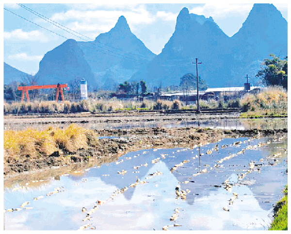 ▲西南村莲藕基地里刚种下藕种的藕田。(七星区农业农村局供图)