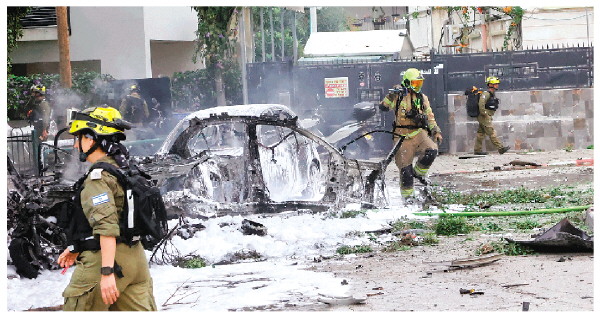 ▲3月15日,安全人员和应急人员在以色列中部城市特拉维夫的导弹袭击现场工作。
