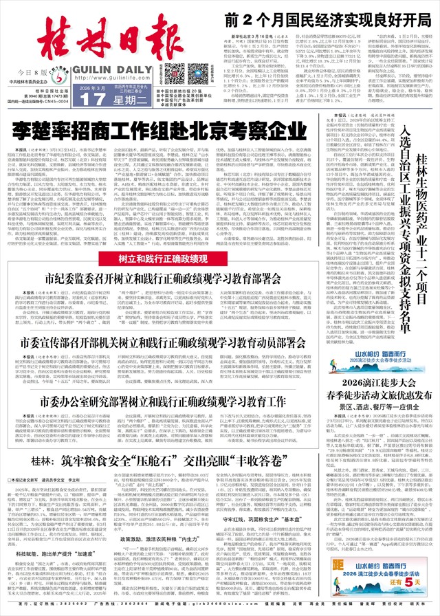 2025年,我市坚决扛起粮食安全政治责任,紧扣国家新一轮千亿斤粮食产能提升行动,以“稳面积、提单产、调结构、增效益”为主线,多措并举筑牢桂北粮仓。在全市上下的共同努力下,粮食生产交出亮眼答卷:实现面积、产量、单产“三增长”,粮食总产同比增加0.54万吨,贡献了自治区增量的83.1%,增量位居全区第一;单产增量和增幅均位列全区第三;涉粮补贴项目资金发放率达94.6%,排名全区第二,为全区粮食稳产增产作出了重要贡献。在3月12日召开的2026年全区春季农业生产暨高标准农田建设突出问题整治工作会议上,我市作交流发言。同时,临桂区、全州县、兴安县粮食生产工作也受到自治区农业农村厅的表扬。
