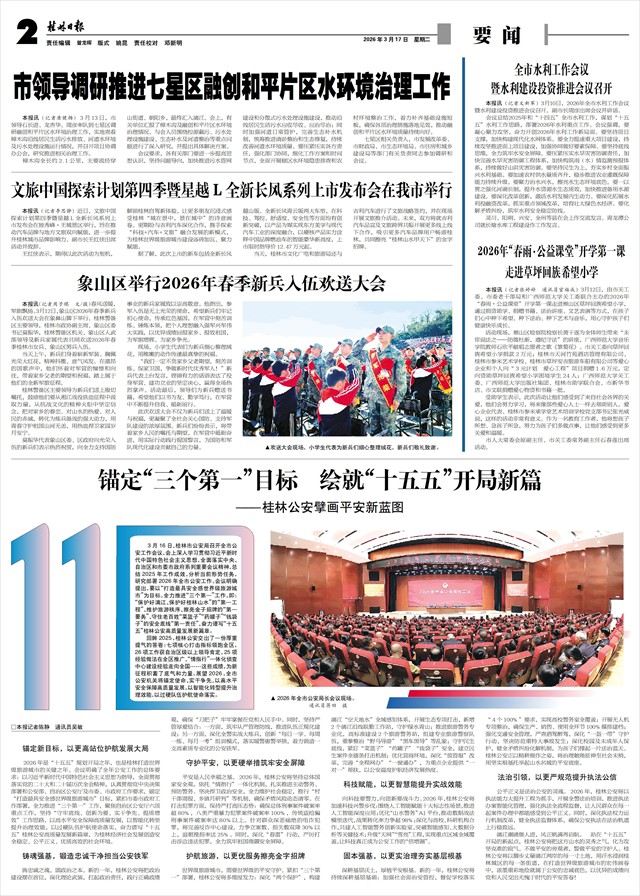 锚定“三个第一”目标 绘就“十五五”开局新篇 ——桂林公安擘画平安新蓝图   3月16日,桂林市公安局召开全市公安工作会议,会上深入学习贯彻习近平新时代中国特色社会主义思想,全面落实中央、自治区和市委市政府系列重要会议精神,总结2025年工作成效,分析当前形势任务,研究部署2026年全市公安工作。会议明确提出,要以“打造最具安全感世界级旅游城市”为目标,全力推进“三个第一”工作,即:“保护好漓江、保护好桂林山水”的“第一工程”、维护旅游秩序、擦亮金子招牌的“第一要务”、守住老百姓“菜篮子”“药罐子”“钱袋子”的安全底线“第一责任”,奋力谱写“十五五”桂林公安高质量发展新篇章。