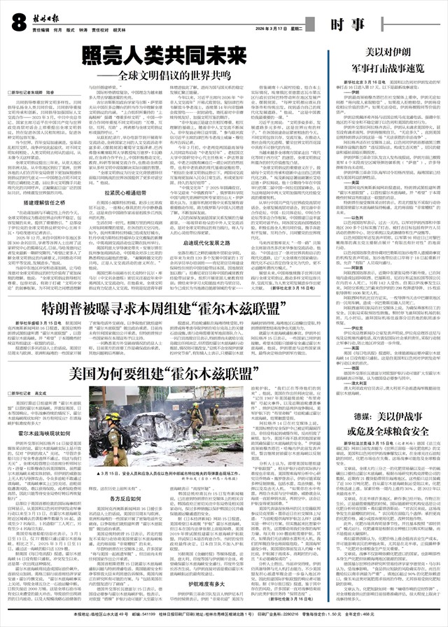 特朗普被曝寻求本周组建“霍尔木兹联盟”   新华社华盛顿3月15日电 据美国阿克西奥斯新闻网站16日报道,美国总统特朗普试图组建所谓“霍尔木兹联盟”,以管控霍尔木兹海峡,并“希望”于本周晚些时候宣布组建这一联盟的消息。
