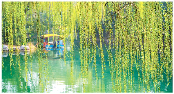 近日,山东省济南市气温回升,大明湖畔的柳树披上新绿,吸引游客前来踏春游览。大明湖位于济南市区,湖岸种有大量柳树,以“四面荷花三面柳,一城山色半城湖”的风光闻名。