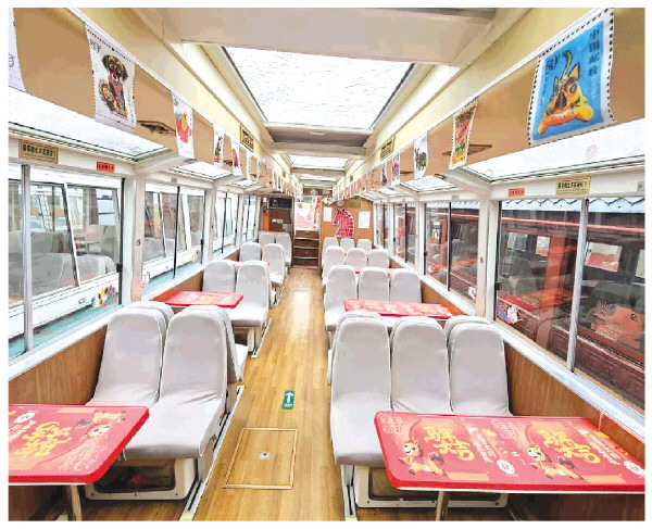 “马年生肖游船”船舱内装饰有精美的“福马”图案,船顶悬挂着色彩鲜艳的生肖吊旗,生肖文化氛围浓厚。 欧靖 摄