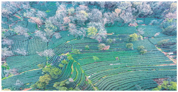 ◥3月19日,梅家坞村的茶农在茶山上采摘西湖龙井“明前茶”(无人机照片)。