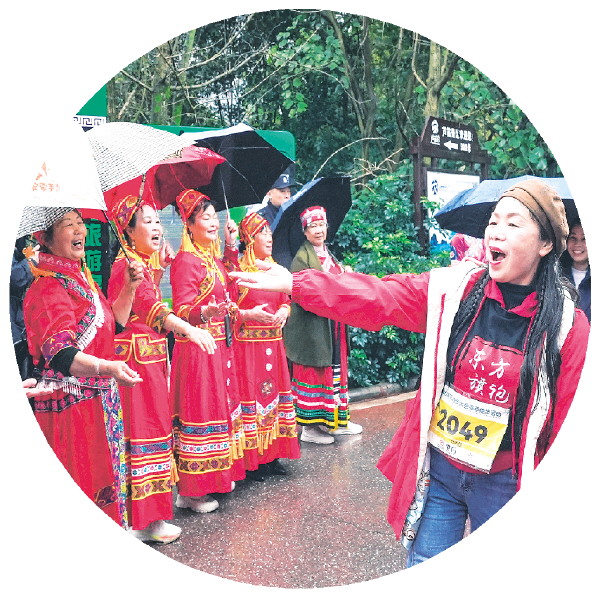再往前走,民族山歌方阵更是将气氛推向高潮——身着民族盛装的阿哥阿姐,用嘹亮的歌声唱出对山水的热爱、对远方客人的欢迎。不少徒步者被歌声感染,跟着哼唱,脚步也更加轻快。