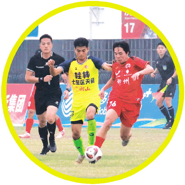 桂林市七星区队(黄)与柳州市柳南区队(红)队员激烈拼抢。