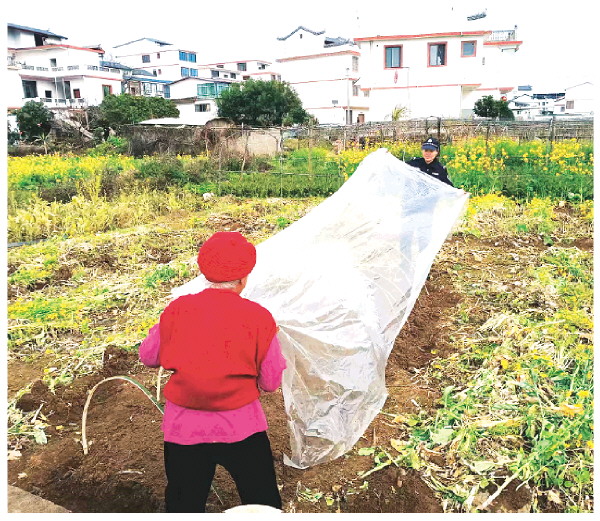 象山公安分局驻村警务助理李芳开展日常巡查中帮助村民铺设地膜。