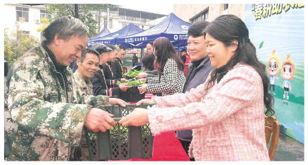 种植户们接过赠送的种苗。 记者刘菁 摄