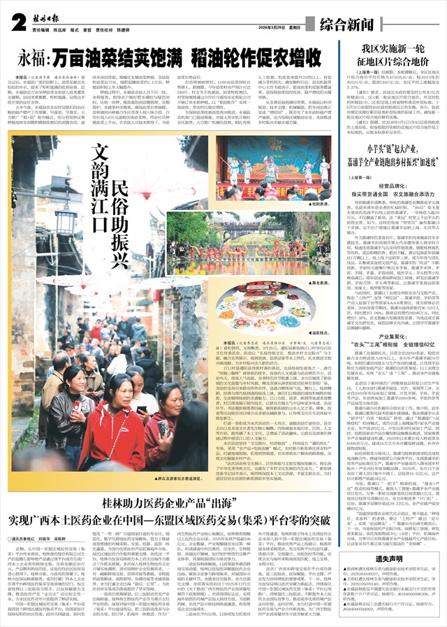 民俗助振兴   本报讯(记者李忠波 通讯员陆仕臣 方梦南/文 记者李忠波/摄)春和景明,文韵飘香。3月25日,灌阳县新街镇江口村举办民俗文化传承活动。活动以“弘扬传统文化 推动乡村文化振兴”为主题,融合农具展示、桂剧表演、油茶品鉴等本土特色,扎实推进文旅兴镇战略,为乡村振兴注入新的活力。