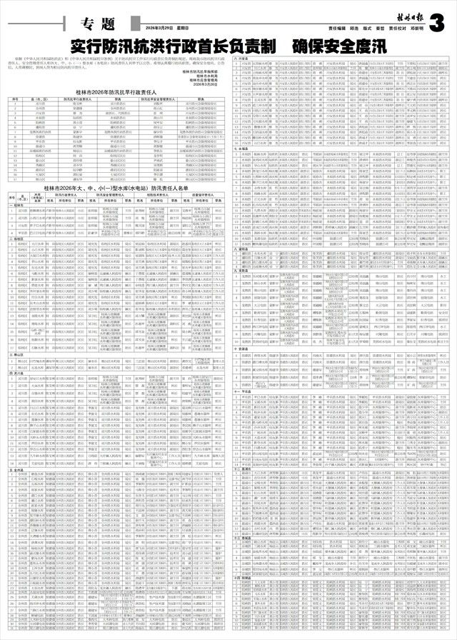 实行防汛抗洪行政首长负责制 确保安全度汛   依据《中华人民共和国防洪法》和《中华人民共和国抗旱条例》关于防汛抗旱工作实行行政首长负责制的规定,现将我市防汛抗旱行政责任人、安全管理责任人和各大、中、小(一)型水库(水电站)防汛责任人名单予以公告。希望认真履行防汛职责,确保安全度汛。公告后,人员调整时,到岗人员为相应防汛抗旱责任人。