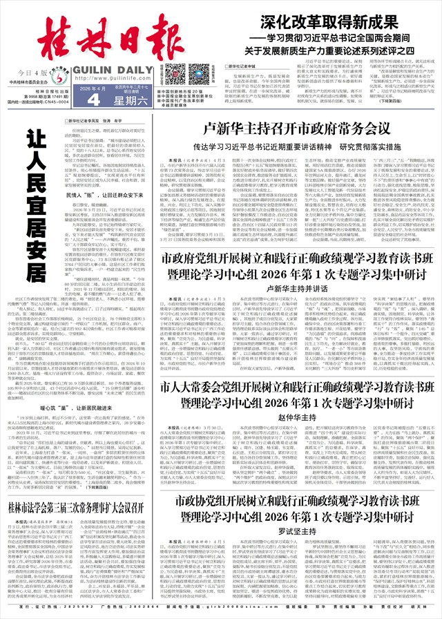 暨理论学习中心组2026年第1次专题学习集中研讨 卢新华主持并讲话   本报讯(记者李云波)4月3日,市政府党组开展树立和践行正确政绩观学习教育读书班暨市政府党组理论学习中心组2026年第1次专题学习集中研讨,深入学习贯彻习近平总书记关于树立和践行正确政绩观的重要论述,贯彻落实习近平总书记关于广西工作论述的重要要求和对桂林的重要指示精神,聚焦“立党为公、为民造福、科学决策、真抓实干”主题,深入开展学习研讨,进一步增强树立和践行正确政绩观的政治自觉、思想自觉、行动自觉,为实现“十五五”良好开局提供坚强保障。市政府党组书记、市长卢新华主持会议并讲话。