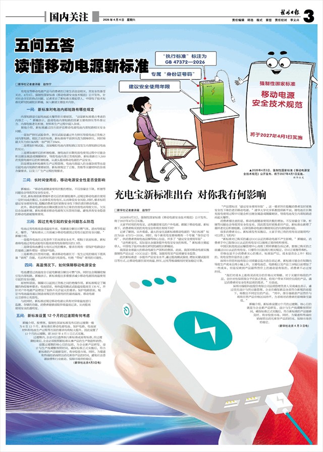 2026年4月3日,强制性国家标准《移动电源安全技术规范》公开发布,将于2027年4月1日实施。
