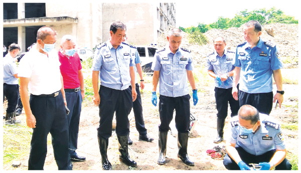 张学杰(前左三)指导现场勘查工作(2021年8月摄)。
