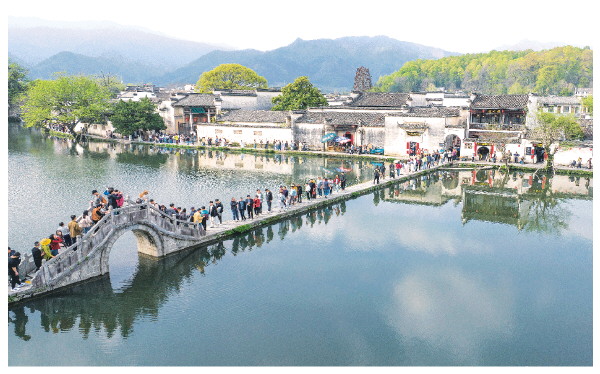 4月4日,游客在安徽省黄山市黟县宏村南湖游玩(无人机照片)。清明小长假期间,人们踏青赏景,乐享春光。 新华社记者杜宇 摄