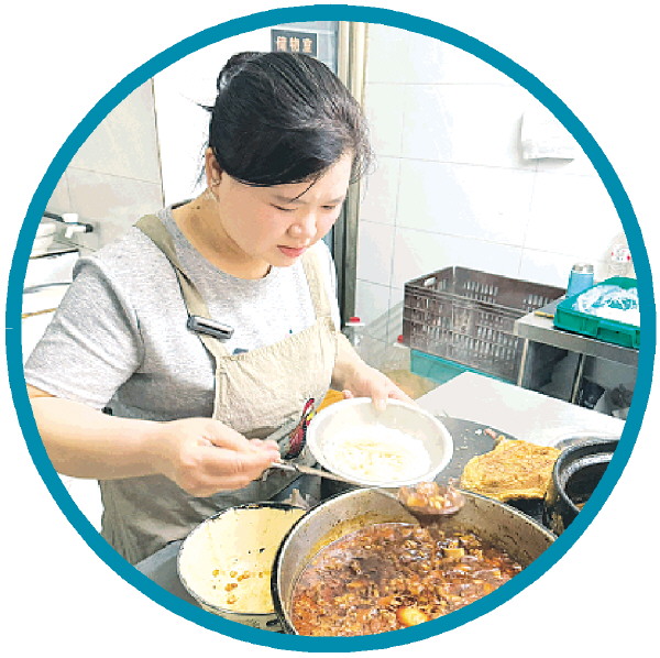 谢长玉在操作间手脚麻利地烫粉、舀牛腩,丈夫在一旁打理要炖煮的牛腩,两人分工明确,忙而不乱。操作台上,炖得软烂的牛腩和黄豆滋滋冒着泡,肉香、酱香、豆香搅在一起,特别诱人。