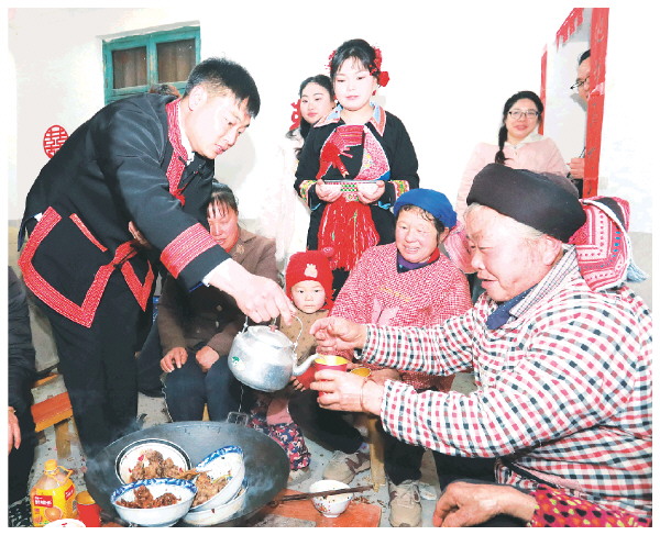 63岁的唐专卫是奉鹏华的大舅,他感慨道:“听说外面结婚动辄十几万彩礼,还得买房买车,多少给家庭带来一定的负担。我们的‘两头扯’婚俗不讲究这些,自家酿的米酒、养的土猪,两家欢欢喜喜,婚事就办得热热闹闹。说到底,‘两头扯’就是两家变一家,双方都不在婚姻中计较,过的就是个‘人情味儿’。”